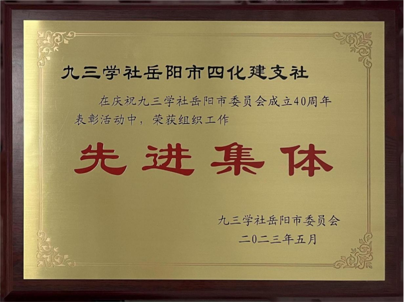 5月29日,在慶祝九三學(xué)社岳陽(yáng)市委員會(huì)成立40周年表彰活動(dòng)中,九三學(xué)社四化建支社獲評(píng)組織工作先進(jìn)集體。