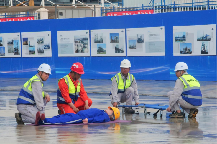 此次應(yīng)急演練模擬在延化化工公司6080項(xiàng)目尿素主框架施工現(xiàn)場(chǎng),一名作業(yè)人員在高處作業(yè)過(guò)程中,因腳手架踏板未固定,安全帶系掛不牢,不慎從三層作業(yè)處墜落受傷。安全員發(fā)現(xiàn)險(xiǎn)情后,迅速啟動(dòng)應(yīng)急救援預(yù)案,由現(xiàn)場(chǎng)30余人組成的通訊聯(lián)絡(luò)、搶險(xiǎn)救援、醫(yī)療救護(hù)、技術(shù)調(diào)查、警戒保衛(wèi)、物資支持等六個(gè)小組分工合作,及時(shí)搶救傷員并對(duì)墜落區(qū)域進(jìn)行疏散隔離,整個(gè)演練過(guò)程井然有序,突發(fā)事故得到了妥善處理。