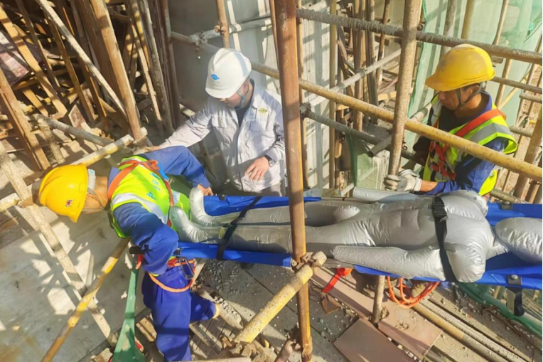 演練過(guò)程中,參演人員劃分為收集組、保障組、警戒組、聯(lián)絡(luò)組、搶救組,通過(guò)模擬突發(fā)“高處墜落”事故,項(xiàng)目部迅速啟動(dòng)應(yīng)急救援預(yù)案,快速、高效、有序?qū)嵤┚仍ぷ?,最大程度降低事故損失,有效減少人員傷亡和財(cái)產(chǎn)損失,維護(hù)施工人員生命安全。