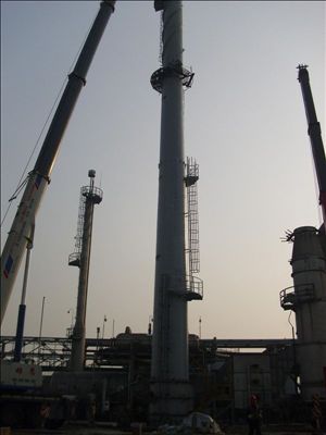 該工程是南通瑞利化學(xué)有限公司為滿足環(huán)保需要,將熱氧化爐裝置原30米煙囪拆除更換成50米煙囪,系該公司今年重點(diǎn)技改項(xiàng)目。新煙囪仍是鋼制,煙囪底座直徑2.8米、頂口直徑1.8米,本體總重62T,一處承擔(dān)基礎(chǔ)、煙囪制作安裝及配套等全部施工任務(wù)。為了確保工程質(zhì)量和吊裝安全,一處現(xiàn)場施工人員精心組織施工,本體制作采取工廠化預(yù)制,分節(jié)運(yùn)到現(xiàn)場再組對;現(xiàn)場使用300T吊車分2節(jié)吊裝,在30米處空中組對。