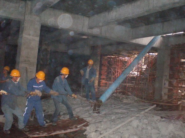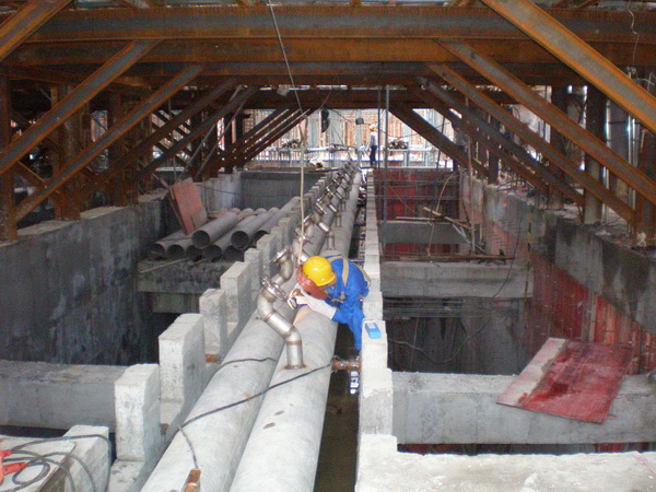 針對(duì)作業(yè)面在地下負(fù)二層,光線較差、通風(fēng)不暢,同時(shí)土建單位正在拆除臨時(shí)支撐,施工現(xiàn)場(chǎng)工作環(huán)境相當(dāng)惡劣等情況。為保證現(xiàn)場(chǎng)施工正常有序的進(jìn)行和施工人員身體健康,項(xiàng)目部采取相應(yīng)措施保證了整個(gè)現(xiàn)場(chǎng)的安全、照明、通風(fēng)。施工人員發(fā)揚(yáng)四化建吃苦耐勞、敢打敢拼的精神,長(zhǎng)期冒雨作業(yè)。吊裝中有吊機(jī)運(yùn)行不到的地方,就積極開動(dòng)腦筋,用技巧、經(jīng)驗(yàn)和人力,保證前期設(shè)備及管道的吊裝倒運(yùn),為后期的施工做好了良好的鋪墊。