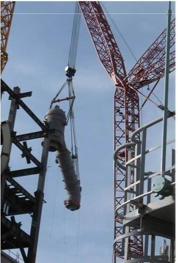 該氣化爐由西安熱工研究院自主研發(fā)設(shè)計、杭州鍋爐公司制造,系中國自主知識產(chǎn)權(quán)的首臺示范爐。其爐體總重600多噸,分上下兩段吊裝,上午10點,現(xiàn)場啟用1250噸履帶式起重機起吊,吊裝高度38米,整個吊裝不到1小時,就將氣化爐的300多噸上段部分與框架內(nèi)的下段部分穩(wěn)妥就位。該爐的就位為配置附爐管線、加快施工進度贏得了時間。