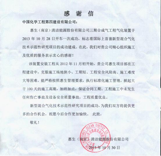 氣化裝置是繼其他各套系統(tǒng)開車成功后最后開車的核心裝置。它的成功開車標志著全部施工任務圓滿完成。分公司在該項目上創(chuàng)造了工程進度、質量安全、業(yè)主服務三個一流,用心血和汗水為業(yè)主奉獻了精品工程,展示了化建湘軍的風采,更獲得了業(yè)主來信高度贊揚!