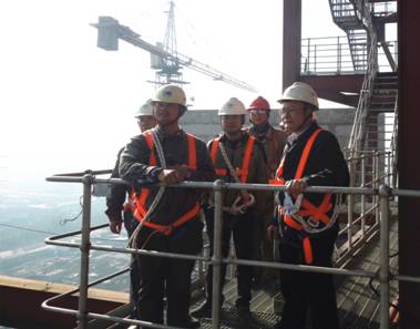 由于此次設備工程分公司承接的寧夏大地循環(huán)發(fā)展股份有限公司天瑞發(fā)電公司4×480t/h型高溫、高壓、循環(huán)流化床鍋爐安裝工程,為公司首次承接的最大型鍋爐安裝項目,因此倍受公司關注。14日,胡流芳一行到項目現(xiàn)場后,立即系上安全帶,登上54米高的鍋爐安裝平臺,一層一層的仔細查看安裝施工細節(jié),詳細了解質(zhì)量過程控制措施,認真檢查各部位的安全防護情況。與此同時,張娣玲對項目部工程施工質(zhì)量過程控制資料、安全資料等進行了認真檢查,并在項目部安全工作例會上對360多名參建員工就施工安全注意事項進行了重點強調(diào)。