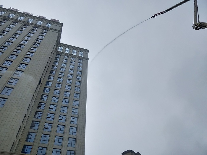 6月22日上午9時(shí)30分,四化大廈9樓濃煙滾滾,樓內(nèi)警鈴大作,員工們手拿濕毛巾,捂住口鼻從樓內(nèi)消防通道快速有序的撒離疏散到安全地帶,工作人員不時(shí)提醒疏散人員清點(diǎn)人數(shù),報(bào)告?zhèn)銮闆r和穩(wěn)定情緒。不到兩分鐘時(shí)間,兩臺消防車風(fēng)馳電掣的駛?cè)氪髲B院內(nèi),全副武裝的消防隊(duì)員快速啟動(dòng)消防裝備,分兩路進(jìn)行救援和滅火。不一會(huì)兒,樓內(nèi)滅火隊(duì)員和消防云梯車幾乎同時(shí)噴出水柱直達(dá)20樓頂。