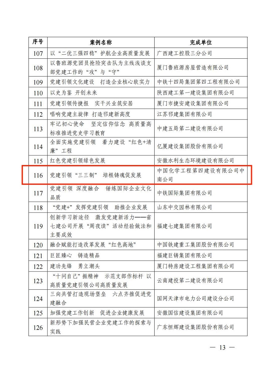 近日,從中國(guó)施工企業(yè)管理協(xié)會(huì)傳來(lái)喜訊,華南公司黨建工作案例《以“五個(gè)三項(xiàng)措施”凝聚青春力量》和中南公司黨建工作案例《黨建引領(lǐng)“三三制”培根鑄魂促發(fā)展》獲評(píng)2022年度“工程建設(shè)企業(yè)黨建工作優(yōu)秀案例”。