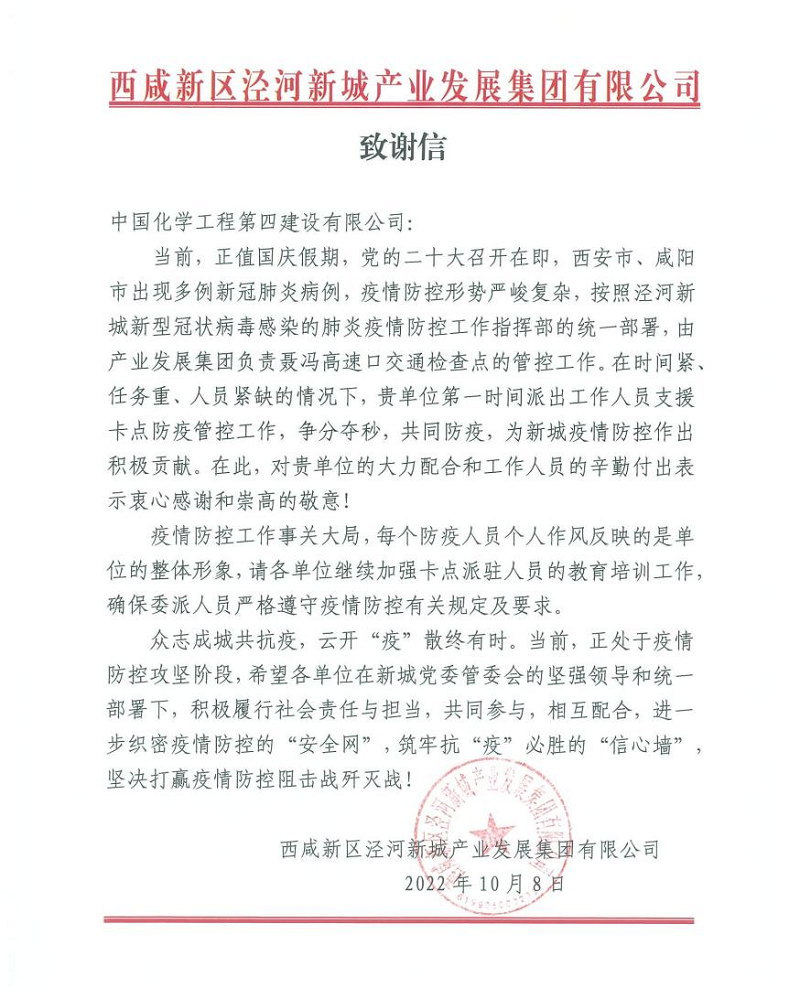 10月9日,陜西西咸新區(qū)涇河新城產(chǎn)業(yè)發(fā)展集團(tuán)有限公司向公司發(fā)來了致謝信,信中對(duì)西部公司泊灣中心項(xiàng)目部在國慶假期、二十大召開前夕抽調(diào)人員支援西安市聶馮高速口防疫檢查的工作表示衷心感謝,對(duì)公司以實(shí)際行動(dòng)助力屬地疫情防控工作給予高度贊揚(yáng)。