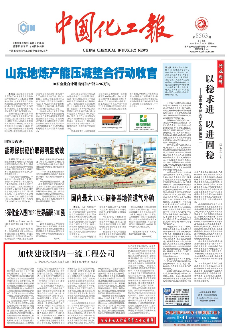 12月23日,《中國化工報(bào)》頭版全文刊登公司黨委書記、董事長胡流芳學(xué)習(xí)貫徹黨的二十大精神體會(huì)文章《加快建設(shè)國內(nèi)一流工程公司》,全文如下。