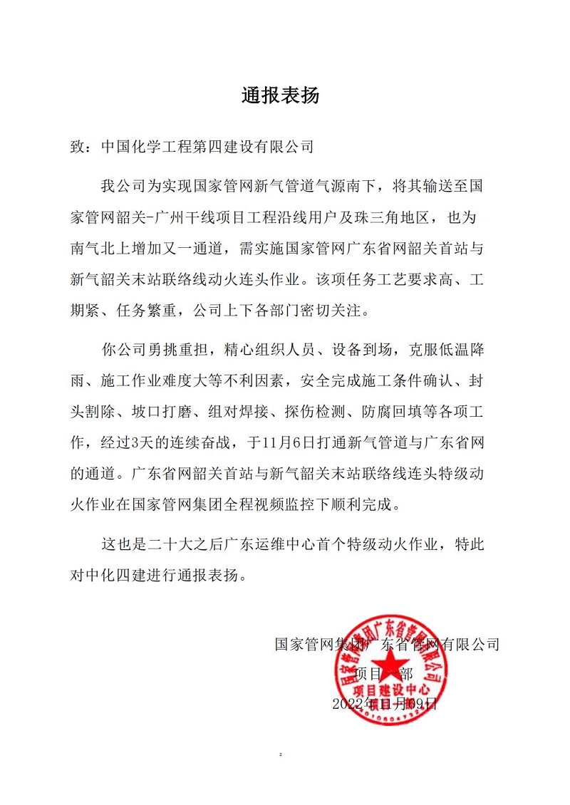 信中指出,東北公司承建的國家管網(wǎng)韶關(guān)-廣州干線項(xiàng)目在面對工程工藝要求高、工期緊、任務(wù)重、施工現(xiàn)場作業(yè)難度大等多重困難的情況下,項(xiàng)目團(tuán)隊(duì)精心策劃、科學(xué)組織、統(tǒng)籌安排,克服各種不利因素,圓滿完成了廣東省網(wǎng)韶關(guān)首站與新氣韶關(guān)末站聯(lián)絡(luò)線連頭特級(jí)動(dòng)火作業(yè)。此次新氣管道與廣東省網(wǎng)通道的打通,是國家管網(wǎng)新氣管道氣源南下的一個(gè)重要節(jié)點(diǎn),也是黨的二十大勝利召開之后,在國家管網(wǎng)集團(tuán)的全程視頻監(jiān)控下,廣東省運(yùn)維中心完成的首個(gè)特級(jí)動(dòng)火作業(yè),特向公司項(xiàng)目團(tuán)隊(duì)的辛勤付出進(jìn)行通報(bào)表揚(yáng)。