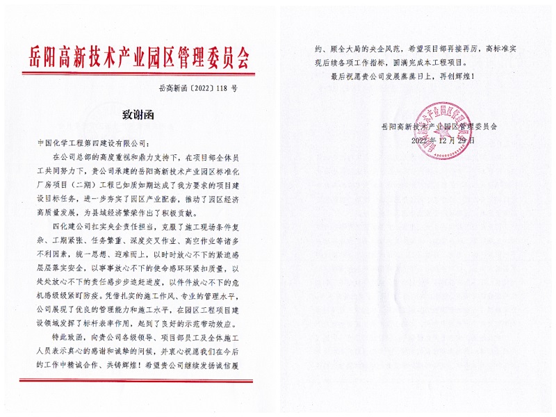 近日,市政工程公司收到岳陽高新技術(shù)產(chǎn)業(yè)園區(qū)管理委員會(huì)發(fā)來的《致謝函》,高度贊揚(yáng)市政公司在承建的岳陽高新技術(shù)產(chǎn)業(yè)園區(qū)標(biāo)準(zhǔn)化廠房項(xiàng)目(二期)工程建設(shè)過程中展現(xiàn)出來的精誠合作、頑強(qiáng)拼搏的施工風(fēng)范,并感謝市政公司對(duì)于園區(qū)產(chǎn)業(yè)配套升級(jí)和經(jīng)濟(jì)高質(zhì)量發(fā)展所做出的努力和貢獻(xiàn)。
