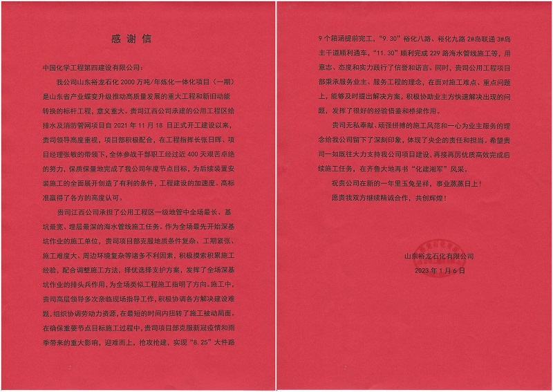 新年伊始,江西公司收到山東裕龍石化有限公司的《感謝信》,感謝江西公司在承建的山東裕龍石化公用工程區(qū)給排水及消防管網(wǎng)項(xiàng)目中,保質(zhì)保量完成了業(yè)主的年度節(jié)點(diǎn)目標(biāo),為后續(xù)裝置安裝施工的全面展開創(chuàng)造了有利的條件,工程建設(shè)的加速度、高標(biāo)準(zhǔn)贏得了各方的高度認(rèn)可,公司無私奉獻(xiàn)、頑強(qiáng)拼搏的施工風(fēng)范和一心為業(yè)主服務(wù)的理念,體現(xiàn)了央企的責(zé)任和擔(dān)當(dāng)。