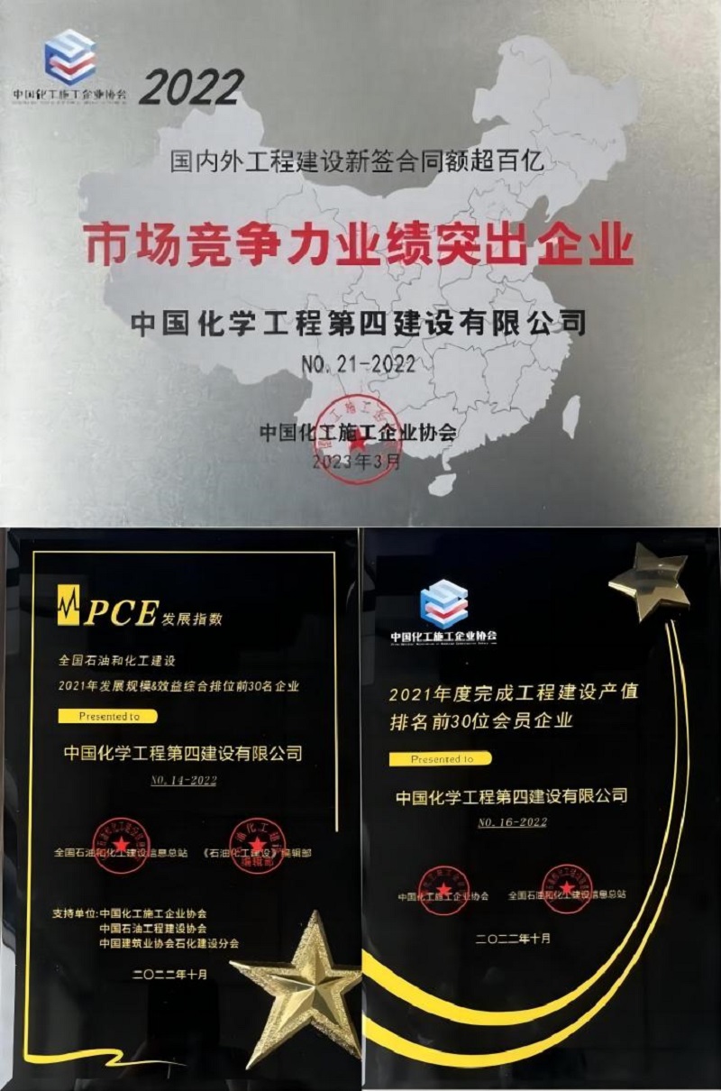近日,從中國(guó)化工施工企業(yè)協(xié)會(huì)2023年年會(huì)暨第十屆六次理事會(huì)傳來喜訊,公司獲得多項(xiàng)榮譽(yù),被授予“2022年國(guó)內(nèi)外工程建設(shè)新簽合同額超百億市場(chǎng)競(jìng)爭(zhēng)力業(yè)績(jī)突出企業(yè)”“全國(guó)石油和化工建設(shè)2021年發(fā)展規(guī)模&效益(PCE發(fā)展指數(shù))綜合排名前30名企業(yè)”和“2021年度完成工程建設(shè)產(chǎn)值排名前30位會(huì)員企業(yè)”。