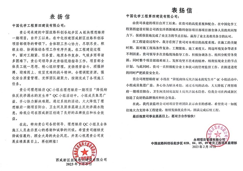 近日,華東公司收到西咸新區(qū)絲路科元建設(shè)有限公司和永明項目管理有限公司發(fā)來表揚信,對華東公司承建的中國絲路科創(chuàng)谷理想臻府一期項目保質(zhì)保量完成節(jié)點目標(biāo)以及“降低砌體反坎滲漏水的發(fā)生率”QC小組活動中所做出的成績,給予表揚和感謝。