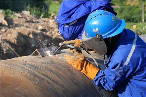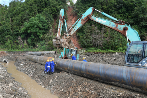 下午13:00,應(yīng)急搶險(xiǎn)突擊隊(duì)抵達(dá)平江后,隨即爭分奪秒展開搶險(xiǎn)修復(fù)工作。隊(duì)員們頂著高溫和烈日,30分鐘完成現(xiàn)場踏勘,確定施工方案,并著手對13根12米長的DN1200管道進(jìn)行對口、點(diǎn)焊、焊接、下管,全面開展搶修工作。