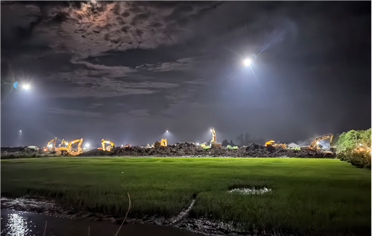 因第三道防線地處岳陽市君山區(qū)良心堡鎮(zhèn)一個小村落,基礎(chǔ)設(shè)施極不完善,施工面臨村內(nèi)稻田、水塘、溝渠縱橫,高壓線、照明線架設(shè)高度不夠,搶建期間社會車輛、搶險車輛密集通行,土方石方須遠(yuǎn)距離運輸?shù)痊F(xiàn)實困難,公司不等不靠,多方協(xié)調(diào)、創(chuàng)新方法,有效克服了大型機(jī)械進(jìn)場難、場內(nèi)交通組織難、土方石方調(diào)配難、安全管理執(zhí)行難等難以想象的困難,比預(yù)期提前8個小時實現(xiàn)堤壩合龍。