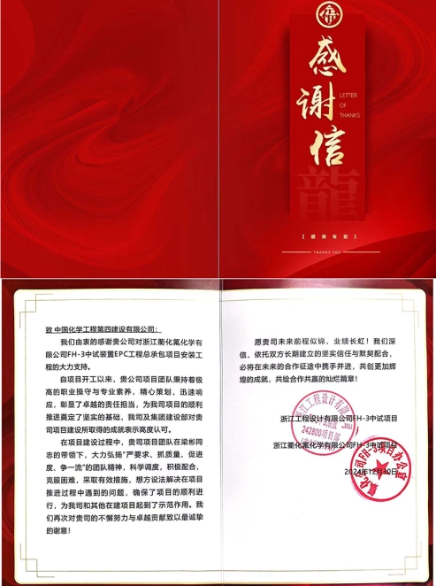 近日,華北公司收到浙江衢化氟化學(xué)有限公司及浙江工程設(shè)計(jì)有限公司發(fā)來的聯(lián)名感謝信,對(duì)衢化項(xiàng)目團(tuán)隊(duì)在項(xiàng)目建設(shè)過程中作出的積極貢獻(xiàn)表示感謝。
