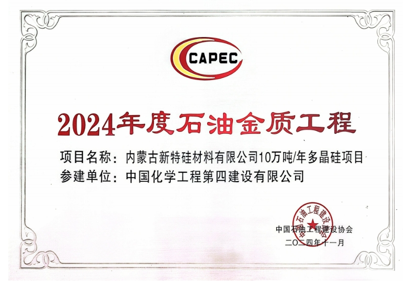 西部公司內(nèi)蒙古新特硅材料項(xiàng)目獲評(píng)2024年度石油金質(zhì)工程