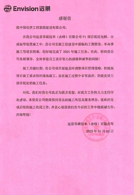 近日,東北公司收到遠(yuǎn)景零碳技術(shù)(赤峰)有限公司發(fā)來的感謝信,對(duì)東北公司安全優(yōu)質(zhì)高效完成各項(xiàng)施工任務(wù)給予高度贊揚(yáng)與衷心感謝。