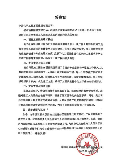 近日,建筑工程公司收到湖南雙陽(yáng)高科化工有限公司岳陽(yáng)分公司發(fā)來感謝信,對(duì)建筑工程公司在電子級(jí)雙氧水項(xiàng)目廠房土建施工中的突出表現(xiàn)給予高度認(rèn)可和衷心感謝。