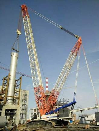 4日上午9時30分,470噸氨合成塔在800噸履帶吊主吊與130噸、180噸兩臺汽車吊抬尾的配合下緩緩吊起,下午3時整,穩(wěn)穩(wěn)就位在預定的位置,圓滿完成了吊裝任務(wù)。