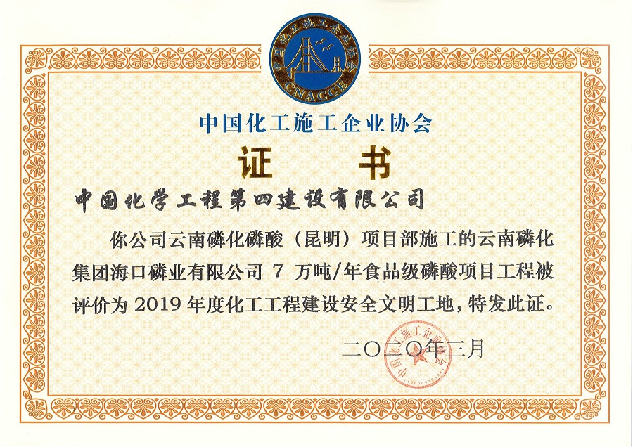 5月21日,西南分公司收到中國化工施工企業(yè)協(xié)會頒發(fā)的云南磷化??诹讟I(yè)有限公司7萬噸/年食品級磷酸項目“2019年度化工工程建設安全文明工地”證書。