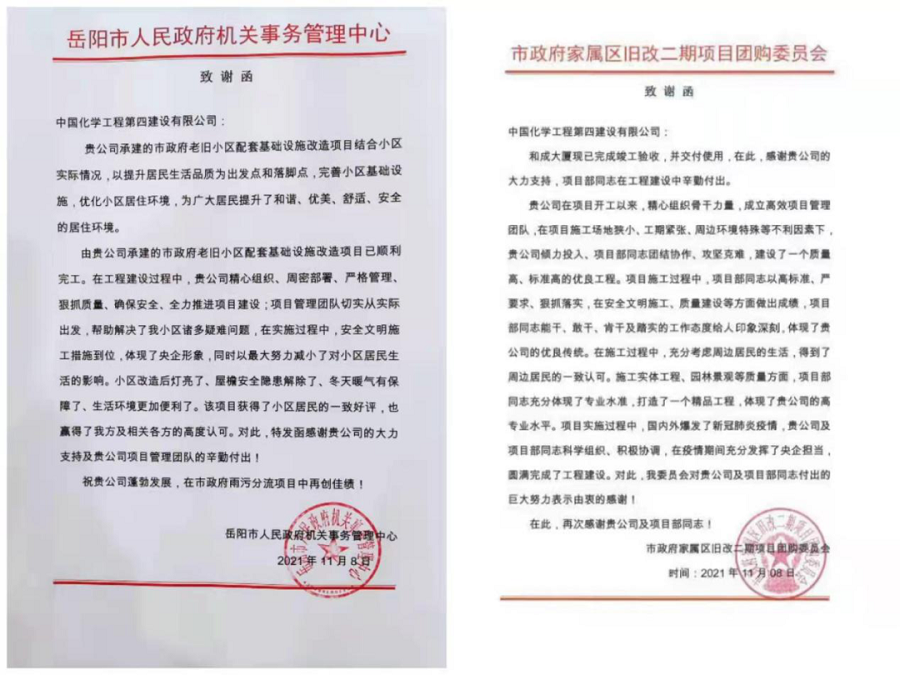 近日,建筑工程分公司和成大廈項目、岳陽市政府家屬區(qū)改造項目分別收到岳陽市政府家屬區(qū)舊改二期項目團購委員會、岳陽市人民政府機關(guān)事務(wù)管理中心送來的兩封致謝函。