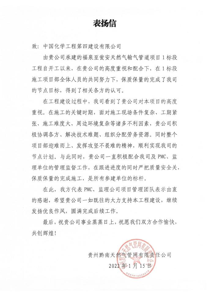 1月19日,由西部分公司承建的福泉至甕安天然氣管道項目收到貴州黔南天然氣管網(wǎng)有限公司發(fā)來的表揚信。