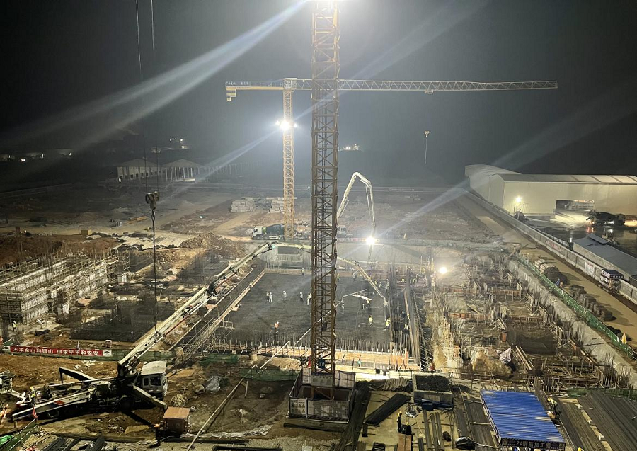 由于項目位于喀斯特地貌區(qū),巖層水孔隙水較豐富,連續(xù)多日的強降雨導致地下滲水嚴重,再加上來自全國各地的施工人員增加了疫情防控的難度。針對這些問題,為確保實現(xiàn)一季度“開門紅”,項目部積極采取應對措施,組織全體項目員工大干搶工期,緊鑼密鼓地投入生產(chǎn)建設當中,按時完成主廠房垃圾池底板大體積混凝土澆筑節(jié)點任務。