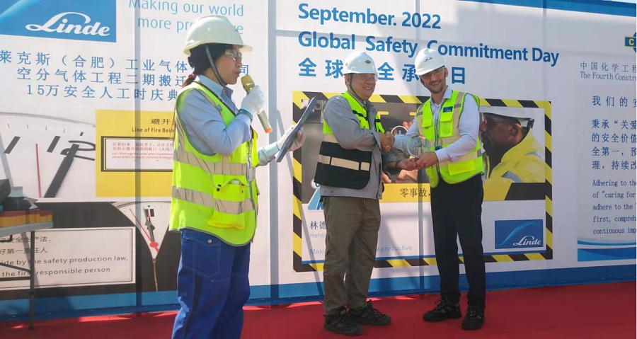 9月19日下午,華東公司普萊克斯(合肥)工業(yè)氣體有限公司空分氣體工程二期搬遷項(xiàng)目在現(xiàn)場舉行15萬安全工時(shí)慶典。業(yè)主林德亞太區(qū)總監(jiān)羅伯特出席慶典。