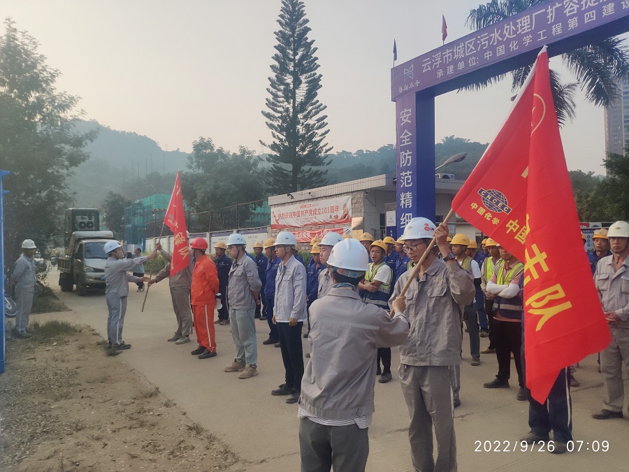 會(huì)上,舉行了“黨員先鋒隊(duì)”“青年突擊隊(duì)”授旗,正式展開突擊施工。項(xiàng)目負(fù)責(zé)人表示,為確保10月10日滿足通水條件,項(xiàng)目部全員將主動(dòng)放棄國慶假期,堅(jiān)守施工一線,確保圓滿完成廠區(qū)相關(guān)管道安裝、二期氧化溝停產(chǎn)改造、以及污泥回流泵站設(shè)備安裝等任務(wù)。
