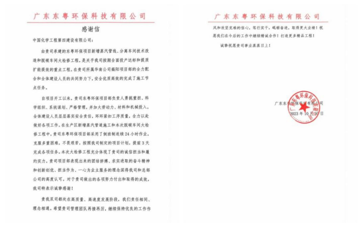 近日,華南公司收到廣東東粵環(huán)保科技有限公司發(fā)來感謝信,對(duì)項(xiàng)目部提前3天完成新增蒸汽管線、分離車間技術(shù)改造和脫碳車間大檢修工程表示誠(chéng)摯感謝。