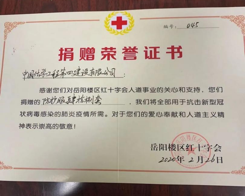 自新冠肺炎疫情發(fā)生以來,公司在積極抓好疫情防控和復工復產(chǎn)工作的同時,切實履行社會責任,多方捐贈防疫物資,馳援防控一線。2月26日,公司向岳陽市岳陽樓區(qū)紅十字會捐贈防護服48套,專項用于支援岳陽樓區(qū)新冠肺炎疫情防控。這也是公司在抗擊新冠肺炎疫情的關鍵時刻,再次向社會捐贈防疫物資。岳陽樓區(qū)紅十字會代表在公司基地接受捐贈,對公司的愛心捐贈表達了誠摯的謝意,并向公司發(fā)放捐贈證書。